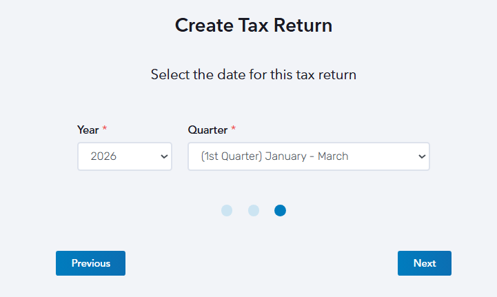 STEP 4: Select the date of the transaction covered in this report. Choose from the Year and Quarter drop-down buttons, then click Next.