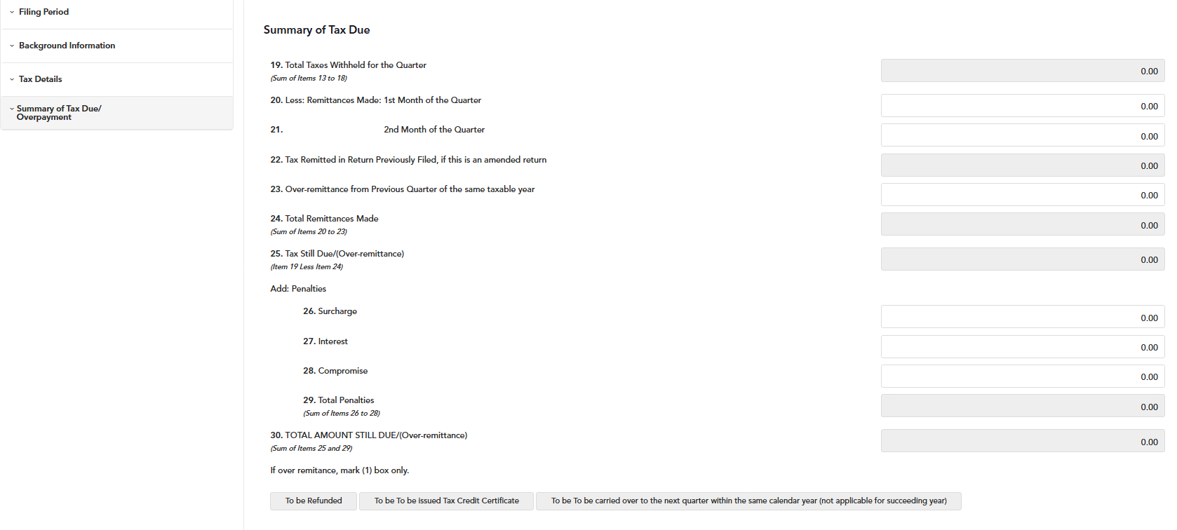 STEP 7: In the last section, the TOTAL AMOUNT STILL DUE (item 30) is automatically calculated based on the sum of Tax Still Due (over-remittance) and Total Penalties (items 25 and 29).