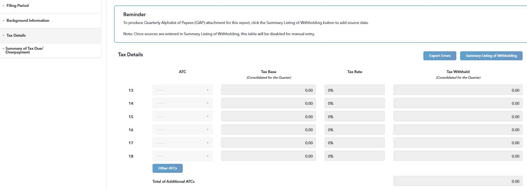To produce a Quarterly Alphalist of Payees (QAP) attachment for your report, simply click the Summary Listing of Withholding button and start adding your source data.