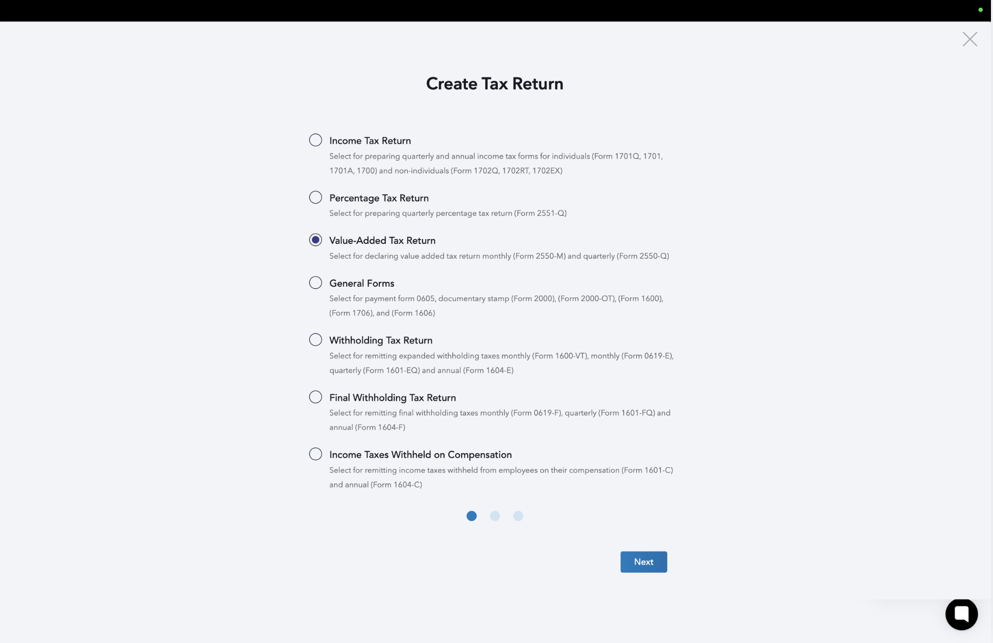 STEP 3: Select the type of tax form you want to generate and click Next.