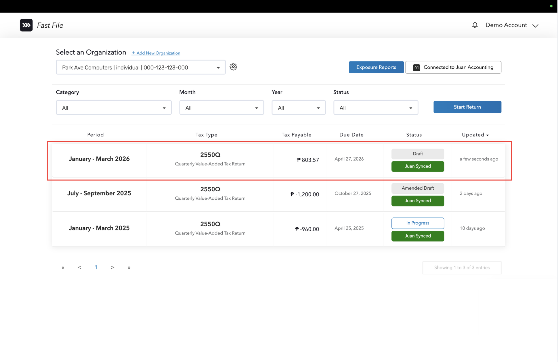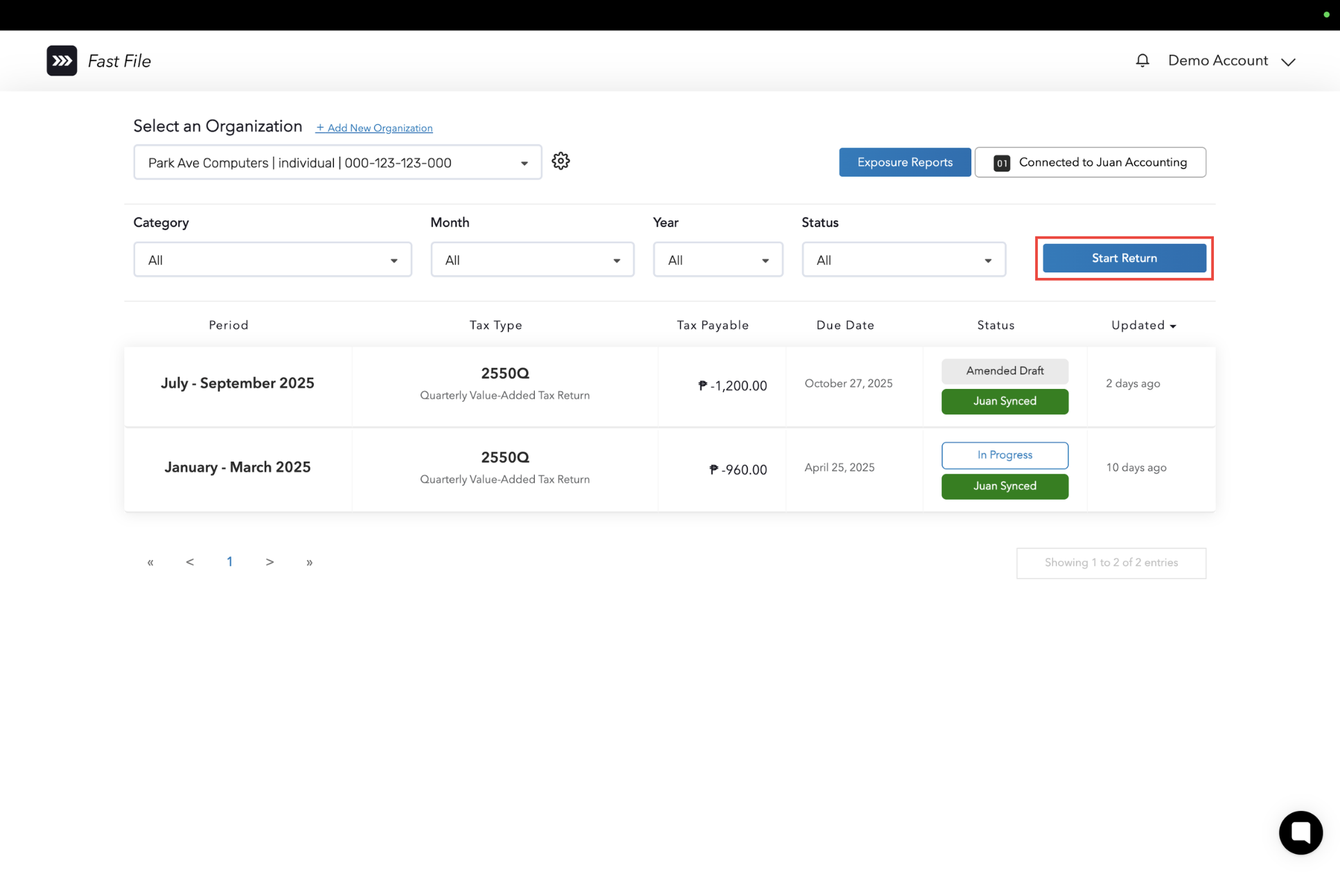 STEP 1: On your Fast File dashboard, select an organization that you wish to generate a form for, then click the Start Return button.