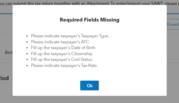 STEP 10: Once the SAWT link (beside item 58) was clicked, a modal will appear with 2 tabs where the attachments of the Tax Payer and his/her Spouse's (if applicable) can be entered.