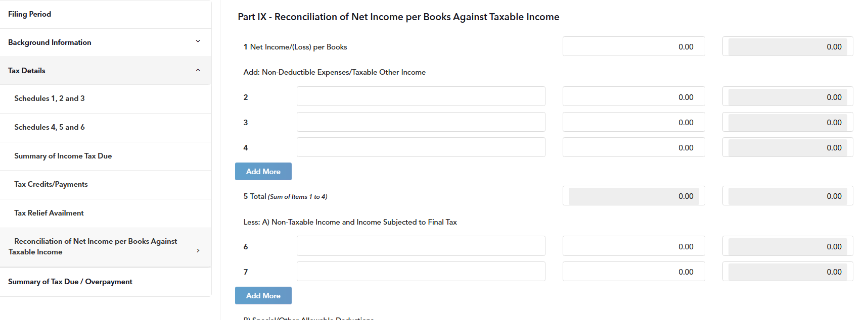 STEP 12: Enter the Tax Filer/Spouse's Reconciliation of Net Income per Books Against Taxable Income Tax.