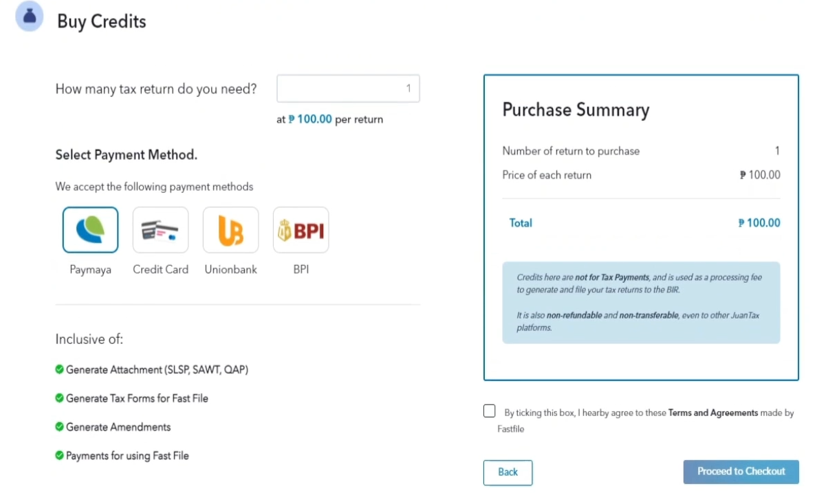 You need enough credits in your Fast File account to be able to e-File and e-Pay your tax forms to BIR.