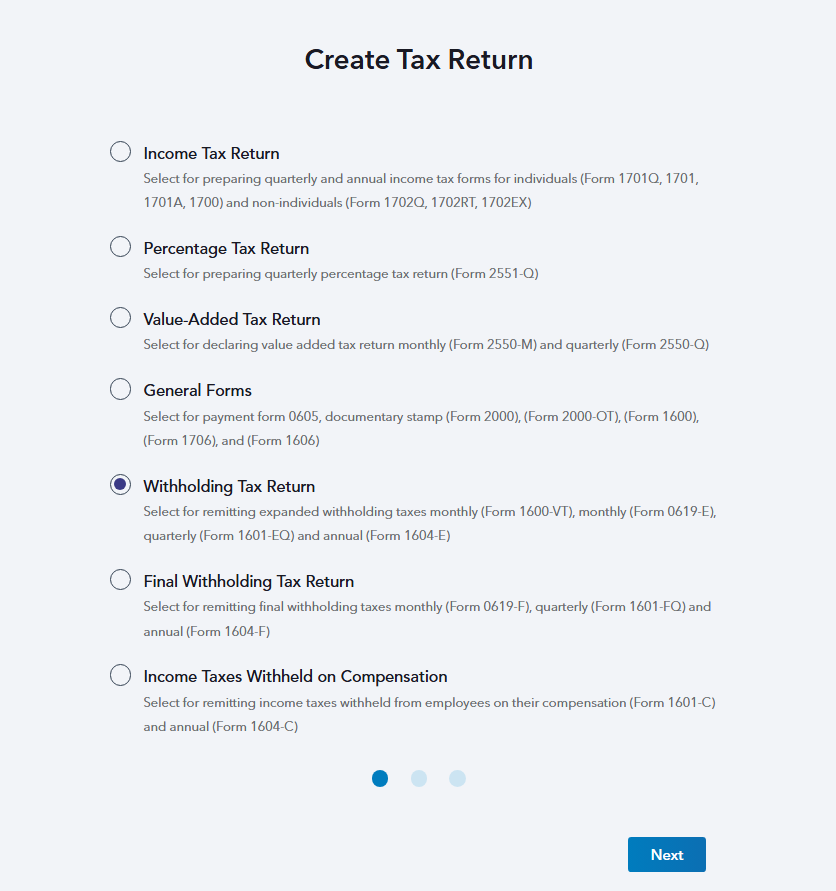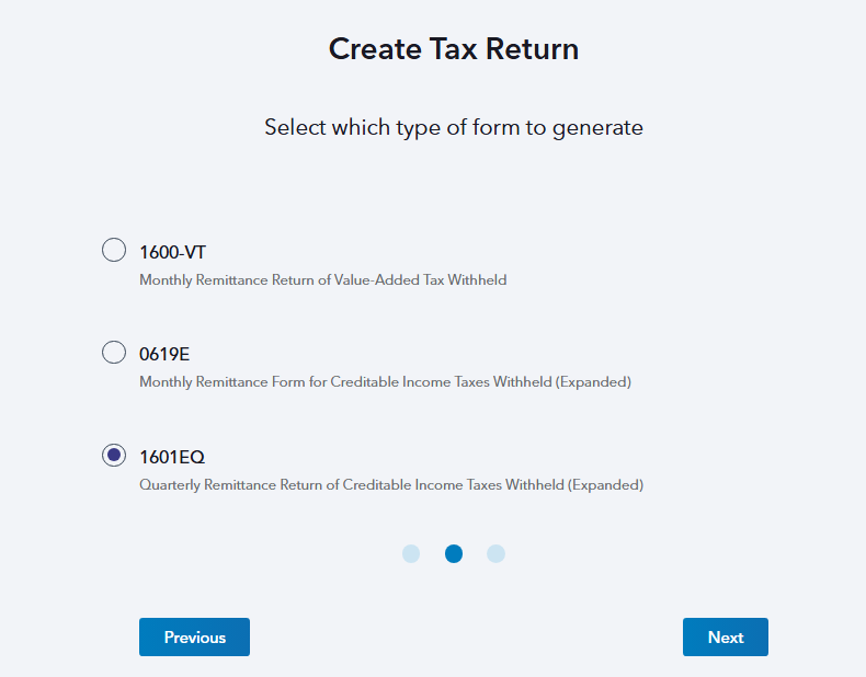 To start generating your 1601-EQ report, you'll just have to access your dashboard and go to Withholding Tax Return, then proceed to the 1601-EQ tab.