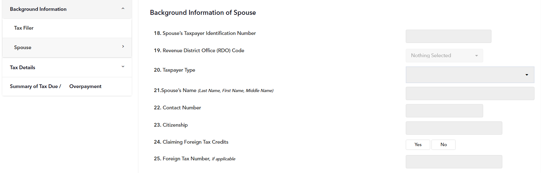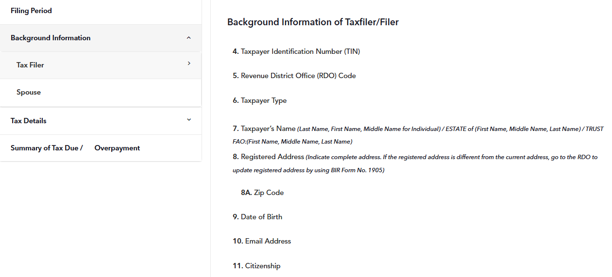 STEP 5: In the second section of the form, enter all the Tax Filer / Spouse's Background information properly based on your BIR Certificate of Registration (COR / Form 2303).