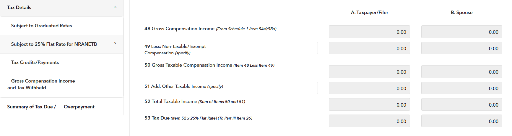 B. If subject to Non-resident Alien not engaged in trade and business (NRANETB) with a flat rate of 25%, fill in items 48 to 53.