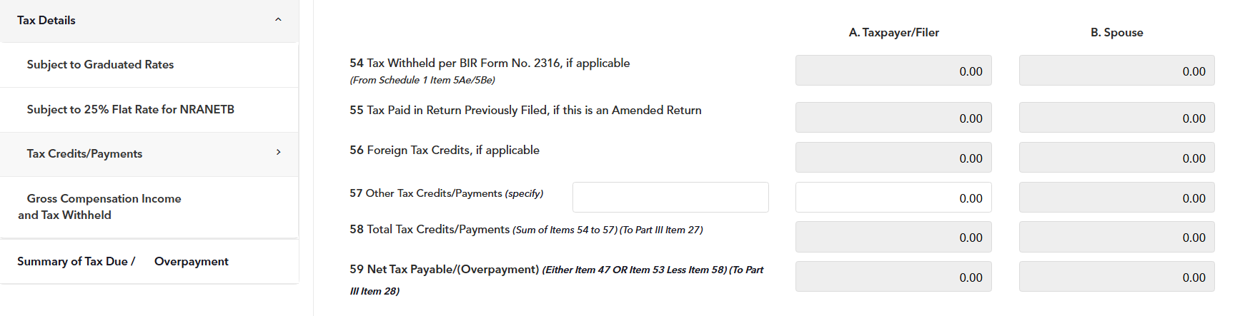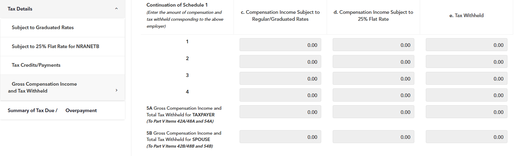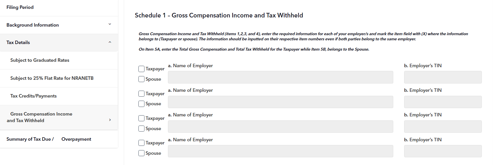 STEP 8: In Schedule 1 – Gross Compensation Income and Tax Withheld (items 1,2,3, and 4), enter the required information for each of your employer/s and mark the item field with (X) where the information belongs to (Taxpayer or spouse). The information should be inputted on their respective item numbers even if both parties belong to the same employer.