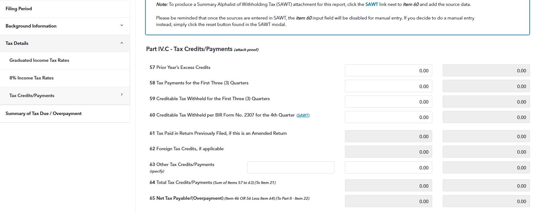 Indicate the amounts as shown in your Audited Financial Statements. You can produce a Summary Alphalist of Withholding Tax (SAWT) attachment for this report by clicking the SAWT link next to Item 60 and add the source data.