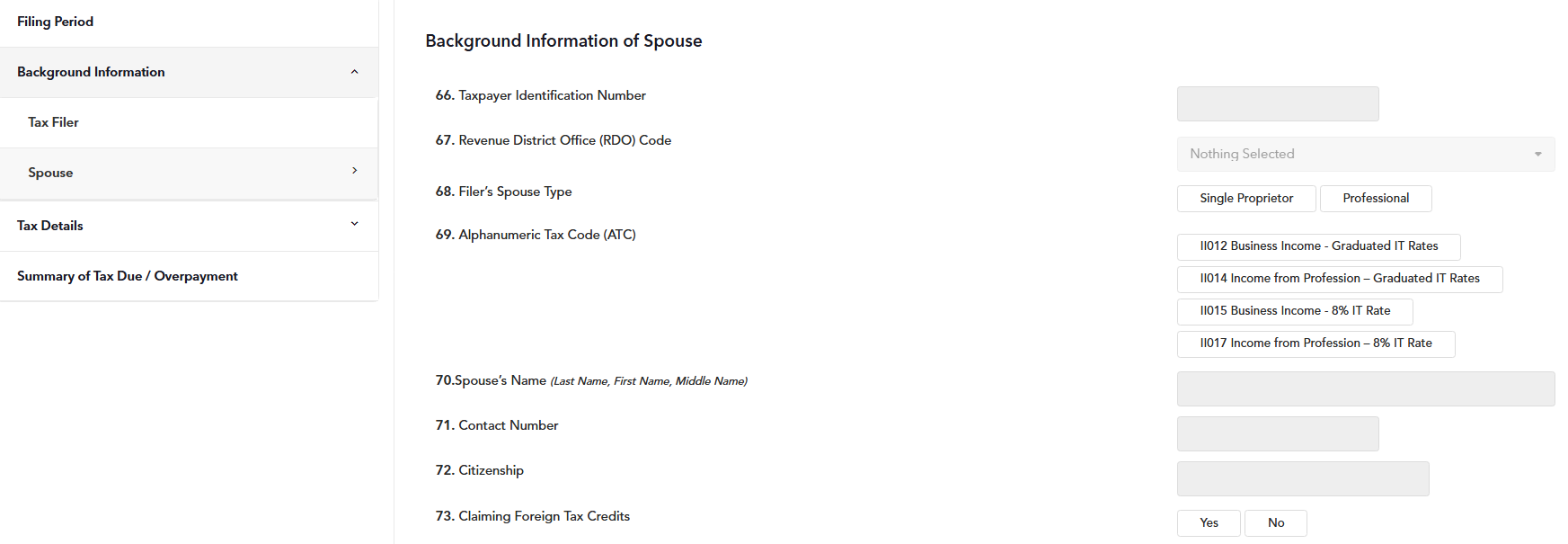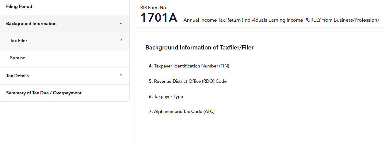STEP 5: In the second section of the form, enter all the Tax Filer / Spouse's Background information properly based on your BIR Certificate of Registration (COR / Form 2303). Select your Taxpayer Type (either Single Proprietor or Professional) and Alphanumeric Tax Code (ATC).