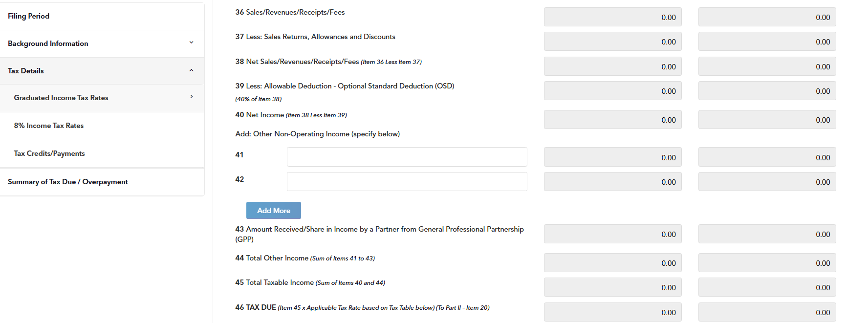 STEP 7: Proceed to the Tax Details section for the computation of your income tax associated with the tax rate you have chosen (OSD or 8%).