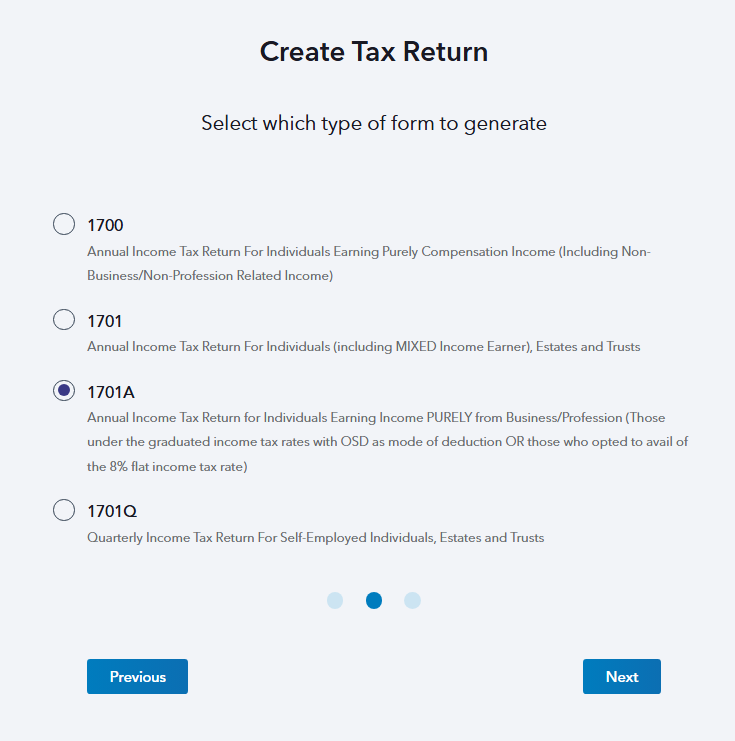 BIR Form 1701-A, also known as the โโAnnual Income Tax Return for Individuals Earning Income PURELY from Business or Profession (those under the graduated income tax rates with OSD as a mode of deduction OR those who opted to avail of the 8% flat income tax rate).