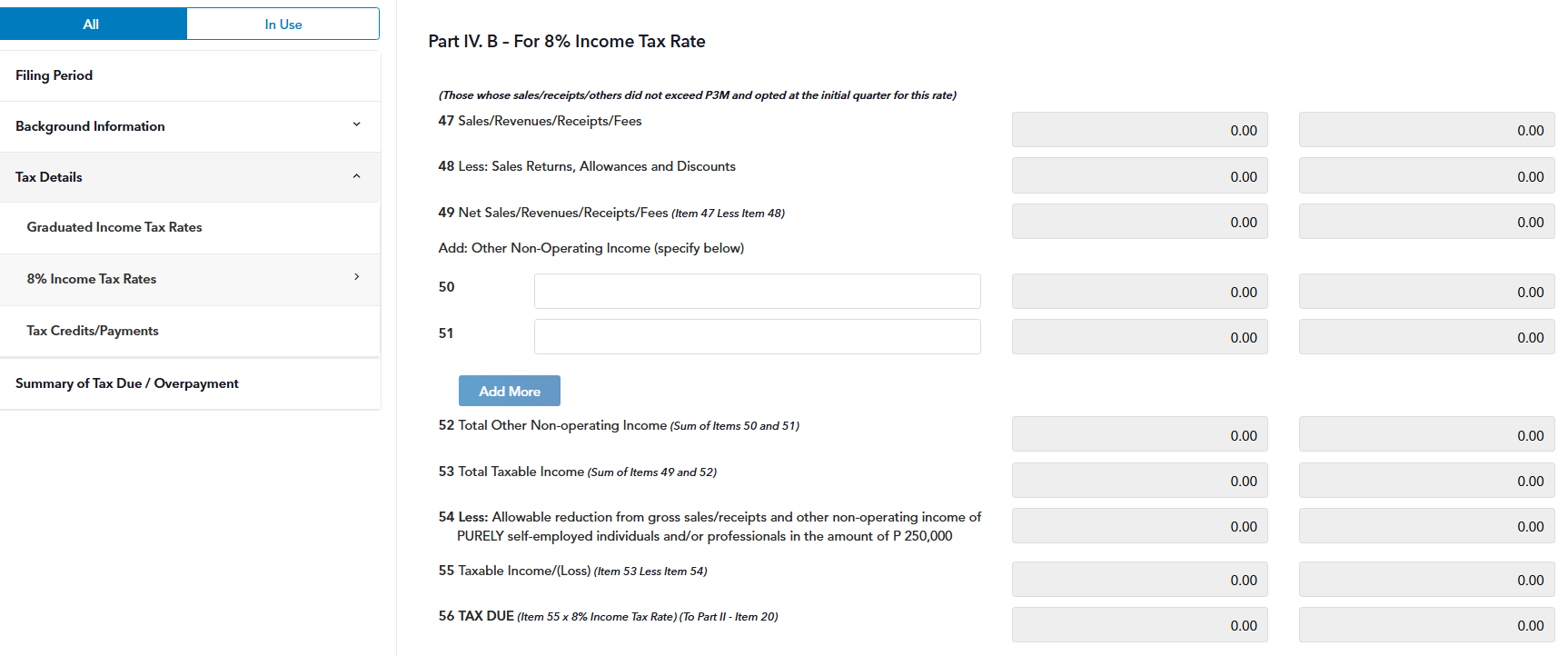 B. Fill in items 47 to 56 if you availed of the 8% flat income tax rate or whose sales receipts and other non-operating income DO NOT exceed 3 million pesos.
